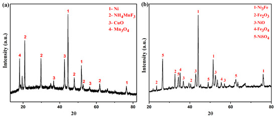 Figure 5a shows that in the water leaching system, the leaching residue contains Ni, NH4MnF3, CuO, and Mn3O4 phases. Nickel oxides, iron salts, sodium salts, and some ammonium fluoride salts enter the liquid phase. Figure 5b shows that in the sulfuric acid leaching system, the leaching residue contains phases of Ni3Fe, Fe2O3, NiO, Fe3O4, and NiSO4. This is due to Ni(OH)2 and fluoride ammonium salt into the liquid phase, and the hydrolysis of fluoride ammonium salt makes Fe into insoluble iron oxide remaining in the leaching residue. Sulfuric acid cannot dissolve Ni completely. The above analysis is consistent with the results shown in Table 2, that is neither water nor sulfuric acid as solvents can completely dissolve nickel, which is not conducive to nickel recovery. The mass fraction of 20~28% nitric acid can completely dissolve the sample. Moreover, the amount of acid required is small, the dissolution efficiency is fast, and the reaction is stable and controllable. Therefore, the choice of mass fraction of 24% nitric acid solution as the solvent is the most suitable.