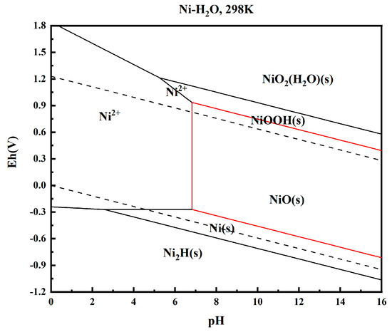 The results show that theoretically, Ni precipitates from the solution in solid form (NiO, NiOOH) in the range of pH = 6.8~16, which is the part surrounded by the red line in Figure 6. Precipitation begins when pH = 6.8, and is completely precipitated when pH = 16. Therefore, by using the precipitation rule of Ni2+ in this range, nickel can be precipitated by adjusting pH to achieve the purification of nickel in high-nickel solution, which is feasible in this experiment.