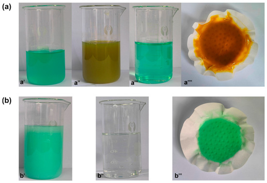 The color change of solution and residue at temperature. Adding NaOH soluion (a): pH = 2–3 (a′), pH = 5 (a′′), pH = 7 (a′′′), the residue (a′′′′); adding Na2CO3 solution (b): pH = 9.8 (b′), pH= 10.5 (b′′), the residue (b′′′).