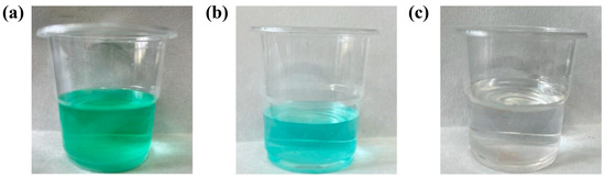 Color change of leaching solution during precipitation at room temperature: the solution after HNO3 completely dissolves the waste electrolytic slag, pH = 2 (a); after pH adjustment, the solution that has removed Fe3+ after filtration, pH = 7 (b); adding Na2CO3, the solution after filtration, pH = 11 (c).
