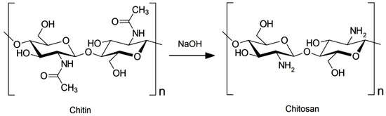 The preparation process involves four steps: first, deproteinization is achieved in sodium hydroxide (2.5 N, NaOH) solution at a solvent to solid ratio (v/w) of 10/1 mL/g at 75 °C during 6 h. The product is then decanted under vacuum, washed thoroughly with distilled water until the pH reaches a neutral value (pH = 7) and is oven-dried at 80 °C for 3 h. The second step consists of demineralization by acid treatment to eliminate calcium carbonate and calcium phosphate naturally present in shrimp shells [77]. Hydrochloric acid of 1.7 N is used with a solvent to solid ratio of 10/1 mL/g at ambient temperature during the 6 h. The final product, chitin, is given a quick rinse in running water before being dried in an oven at 80 degrees Celsius for 3 h. The subsequent procedure is referred to as “decolorization,” and its purpose is to remove the pigments from the chitin using reagents, such as ether, ethanol, sodium hypochlorite, or hydrogen peroxide. In this study, a 30% concentration of hydrogen peroxide of was used at ambient temperature for 10 min. After that, the samples were washed thoroughly with tap water to remove any residual impurities and oven-dried at 80 °C for 3 h. The last step was deacetylation by concentrated sodium hydroxide (50%) solution with a solvent to solid ratio of 10/1 mL/g at ambient temperature for 48 h. By removing the acetyl group from the chitin in this stage (Figure 2), the goal was to transform the chitin into chitosan. Chitosan, the product that was obtained, was put through a filter, washed with distilled water until the filtrate became neutral, and then oven-dried at a temperature of 50 °C overnight.