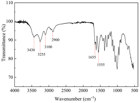 FTIR is the most suitable technique for a quick and simple characterization of DD of chitosan. This parameter is extremely important as it influences the properties of the macromolecular chains of the polymers and their behavior in solution, namely the solubility of the chitosan, the flexibility of the macromolecular chains, and the polymer conformation. Figure 3 depicts the infrared spectrum of the chitosan sample. It displays a series of bands: the peak noticed at 1555 cm−1 corresponds to N–H bending of the secondary amide II band of –CONH– whereas the amide I band resulting from hydrogen and hydroxyl interactions (due to the deacetylation of chitin) is observed at 1655 cm−1. Small peaks around 2900 cm−1 are assigned to the –CH2– and –CH3 groups. –OH, stretching vibrations of water, and hydroxyls as well as –NH stretching vibrations of free amino groups, are observed at 3100–3500 cm−1. Using the Baxter equation (Equation (1)), the DD of the produced chitosan was found to be 53.33%.