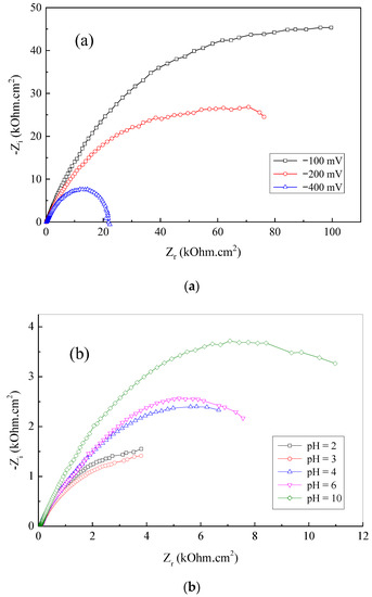Impedance spectra in Nyquist representation of CH/CPE electrode in 0.1 M KNO3 electrolyte: (a) at different polarization potentials and (b) at different pH values.