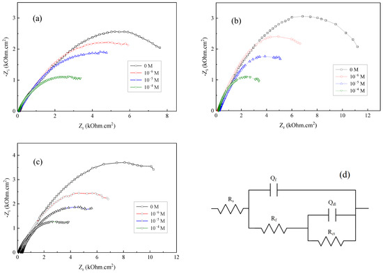 Impedance spectra in the Nyquist diagrams in 0.1 M KNO3 in the presence of different concentrations of Pb2+ recorded on: (a) CH/CPE, (b) TiO2-CH/CPE, and (c) NiO-CH/CPE electrodes. (d) Equivalent electric circuit proposed to fit the impedance spectra.