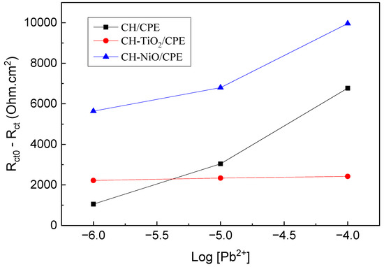 These results indicate that functionalized chitosan demonstrates improved performance in terms of –charge–transfer compared to non-functionalized chitosan. This enhancement becomes particularly pronounced in the low lead ion concentration range (<10−5 M) for TiO2, while the influence of NiO addition can be observed across all tested concentration ranges.