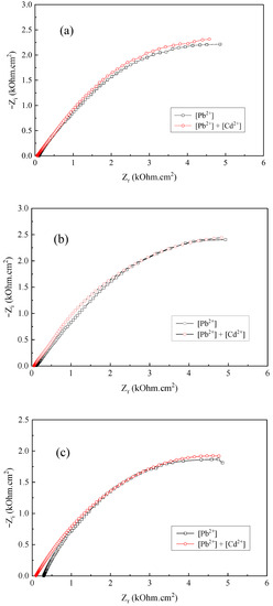 The selectivity of the developed impedimetric sensors toward Pb2+ ions was tested in the presence of Cd2+ interfering ions at different concentrations. The typical Nyquist plots of impedance spectra of Pb2+ solution in the absence and presence of Cd2+ are shown in Figure 7a–c.