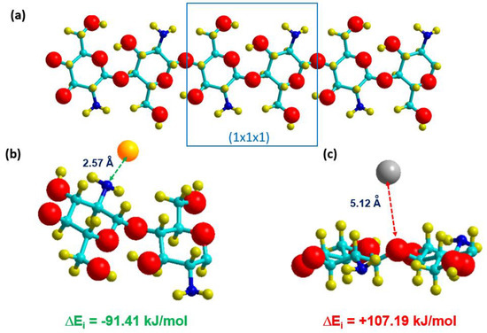 where EMC2+ is the total energy of the heavy metal cations adsorbed on chitosan molecule, EC is the total energy of chitosan, and EM2+ is the energy of isolated cations. Therefore, negative interaction energy suggest that the adsorption process is exothermic, and that the detection of metal cations leads to stable configurations. On the other hand, positive adsorption energy suggest that unstable configurations may emerge from the detection of metal cations. Figure 8b,c present the geometries that are the most stable for the various complexes formed by lead and cadmium ions that are adsorbed on chitosan, along with the energy that are associated with those geometries. Data gathered in Figure 8 indicate that the Pb2+/chitosan complexation is an exothermic process, as calculated adsorption energy is negative (−91.41 kJ/mol), and that the interaction with Cd2+ is unfavorable, as the interaction energy is positive (107.19 kJ/mol). Therefore, the chitosan is only capable of adsorbing lead ions (Pb2+) when exposed to wastewater that also includes cadmium.
