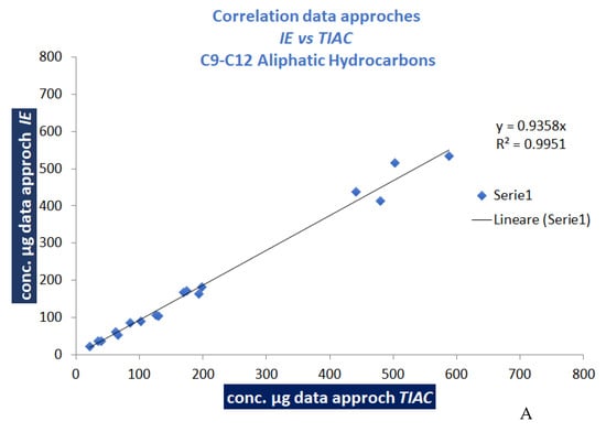 C5-C8 aliphatic fraction: data correlation (A) and data trend (B) between the method reported in [13] and the official approach.