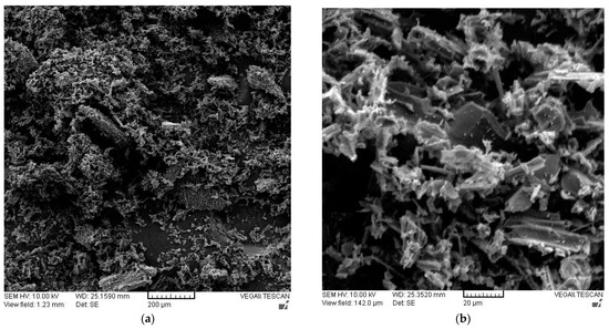 SEM images of the activated carbon sample at two different magnifications with different inset scales (a) 200 µm, (b) 20 µm.