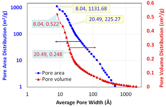 Cumulative pore size and pore volume variation with the pore size for the adsorbent sample. Insets show the pore size and corresponding value of ordinate.