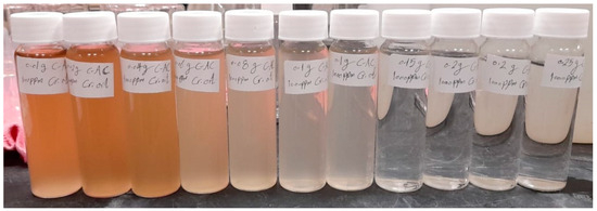 Different dosages of the AC were used with 40 mL of solution in TOC (total organic carbon) vials. The solution with a fixed quantity of the AC was mounted on a shaker for 2 h at 25 ± 0.5 °C to ensure an intimate mixing of the adsorbent with the emulsified fuel (gasoline/diesel) solution. The contact duration of the adsorbent with the contaminated solution helped to remove the contaminant from the solution, thereby yielding an equilibrium concentration of the contaminant in the remaining solution. The solution was then filtered using a Büchner funnel and a Büchner flask, connected to a vacuum pump, to remove the AC before the measurement of the oil concentration. The filtered samples are shown in Figure 3, where the initial concentration of the oily contaminant was kept at 1000 ppm while the adsorbent dosage was varied from 0.01 to 0.25 g.