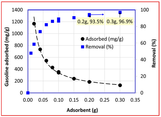 The experimental results are shown in Figure 4. As the amount of the adsorbent was increased, the removal percentage also increased, as seen on the right-hand side ordinate of the figure. Almost 90% removal was obtained when 80 mg of the adsorbent was used in a 40 mL solution of 1000 ppm gasoline. The removal percentage gradually increased to 93.5% and 96.7% when 0.2 g and 0.3 g adsorbents, respectively, were used. The adsorbent also showed high adsorption capacity, as seen on the left-hand side ordinate of the figure. With a small amount of the adsorbent (i.e., 200 mg), the gasoline adsorbed was approximately 1300 mg/g. These results clearly highlight the high efficacy of the adsorbent for the gasoline uptake from the contaminated water.