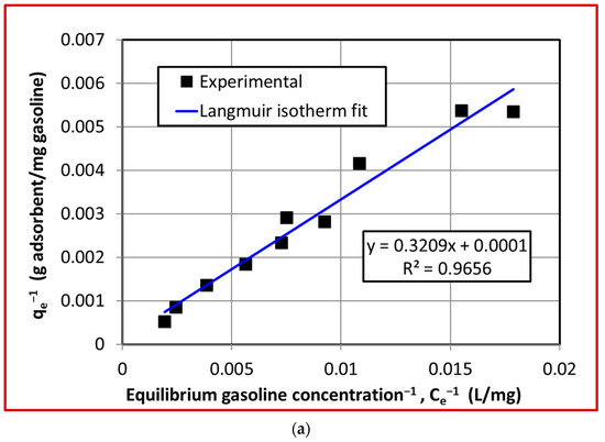 The fit of the experimental data with the Langmuir isotherm is shown in Figure 5a where is plotted against according to Equation (6). The coefficient of determination, denoted by R2, quantifies the difference between the actual value of the dependent variable and the one predicted from the independent variable. Ideally, its value is unity for a perfect fit. In the present case, R2 = 0.966 is an indication of a reasonably good description of the batch equilibrium data by the Langmuir isotherm model. The y-intercept in this case is , which, in fact, yields the maximum adsorption capacity of the absorbent. The smaller the y-intercept, the higher the uptake capacity of the adsorbent. For this means that the uptake of gasoline by the adsorbent can reach as high as eight times its own weight. Clearly, activated carbon employed here is an effective adsorbent for the adsorptive removal of the gasoline from the aqueous phase.