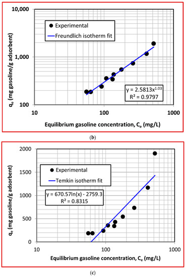 The comparison of the experimental data with the Freundlich isotherm model is presented in Figure 7b. The agreement in this case is excellent with the R2 = 0.9787. This value is higher than that obtained for the case of the gasoline. This means that the underlying mechanism of the adsorption of the diesel onto the adsorbent is better described by the Freundlich model, correlating the binding process to the surface heterogeneity and the variation in the heat of adsorption. The plot of is linear with a slope of 0.83. Although the maximum adsorption capacity is higher for diesel than gasoline, gasoline, owing to its higher slope of 1.03, shows a stronger dependence of the equilibrium adsorption capacity on the equilibrium contaminant concentration compared to the present case of diesel with a slope of 0.8255.