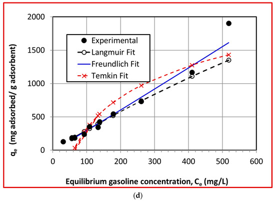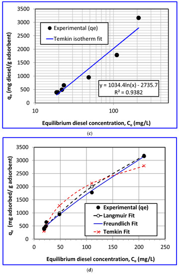 The comparison of all three isotherm models with the experimental results of the diesel adsorption is presented together in Figure 7d. It clearly shows that the best agreement is obtained with the Freundlich model, followed by the Langmuir and the Temkin models.
