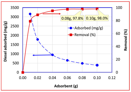 Variation in the diesel adsorption and removal capacity with the adsorbent amount.