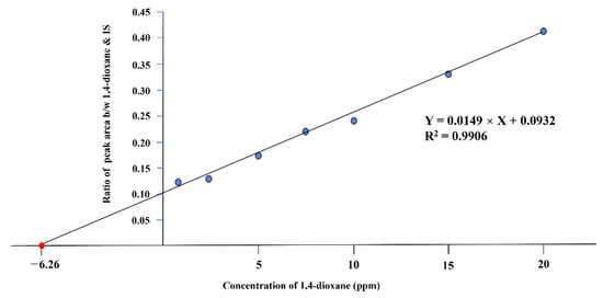 The amount of 1,4-dioxane contained in PEG 200 was calculated via a standard curve from 1 ppm to 20 ppm 1,4-dioxane standard solutions (Figure 1). The formula of the standard curve was Y = 0.0149 × X + 0.0932, where Y was the ratio of peak areas between 1,4-dioxane and cyclohexanone, and X was the added concentrations of 1,4-dioxane. The coefficient of determination (R2) of the standard curve was higher than 0.99, which showed good linearity. From the x-intercept in Figure 1, the concentration of 1,4-dioxane in PEG 200 can be estimated [22], and it was 6.26 ppm.