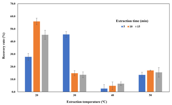 The recovery rates of 1,4-dioxane extraction in PEG 200 by ultrasound are shown in Figure 2. From the results, the highest recovery rate was obtained at 55.9 ± 2.6% when extracted at 20 °C for 10 min, and the best recovery rate (45.6 ± 2.3%) at 30 °C was obtained when extracted for 5 min. It was found that the recovery rate was significantly reduced to less than 20% under the conditions at 40 °C and 50 °C. It was considered that 1,4-dioxane was in an under unstable state at higher temperatures with ultrasound cavitation. Similar to our results from the study of Son et al. [23], ultrasonic treatment at 25 °C for 2 hrs presented the decomposition of more than 75% of 1,4-dioxane.