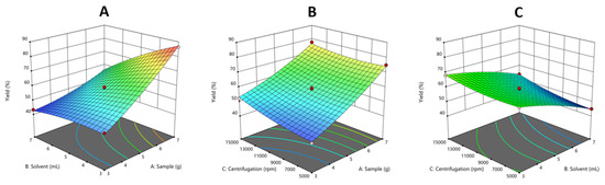 Three-dimensional response surface plots showing the effects of the interactions of sample weight, solvent volume, and centrifugation speed on 1,4-dioxane liquid/liquid extraction. (A) Weight of sample interaction with solvent volume; (B) weight of sample interaction with centrifugation speed; (C) solvent volume interaction with solvent volume. The other component is adjusted to its center value.