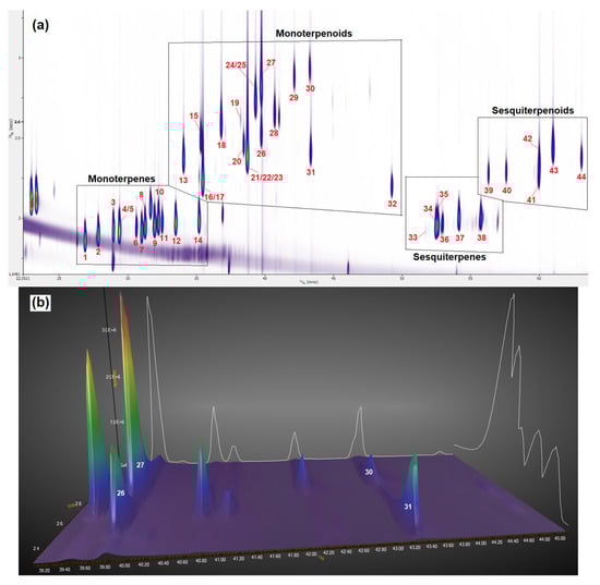 (a) GC × GC-TOFMS chromatogram of a standard mixture containing 44 terpenes and terpenoids. (b) Expansion of the surface chart showing the enhanced separation of hexahydrothymol (26) and (−)-borneol (27), and geraniol (30) and (+)-pulegone (31) in the second dimension. Compound numbers are given according to Table S1.