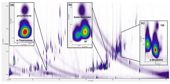 GC × GC-TOFMS chromatogram of Ultra Sour. (a) Expansion chromatogram showing enhanced separation of the monoterpenes α-terpinolene and p-cymenene. (b) Expansion chromatogram showing enhanced separation of an unidentified sesquiterpene (87) and a sesquiterpenoid, trans-nerolidol. (c) Expansion chromatogram showing enhanced separation of sesquiterpenoids α-bisabolol and an unidentified sesquiterpenoid (125). Compound numbers are given according to Table 1.