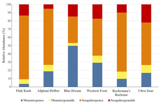 Relative abundance (%) of monoterpenes, monoterpenoids, sesquiterpenes, and sesquiterpenoids regions in six cannabis strains.