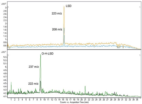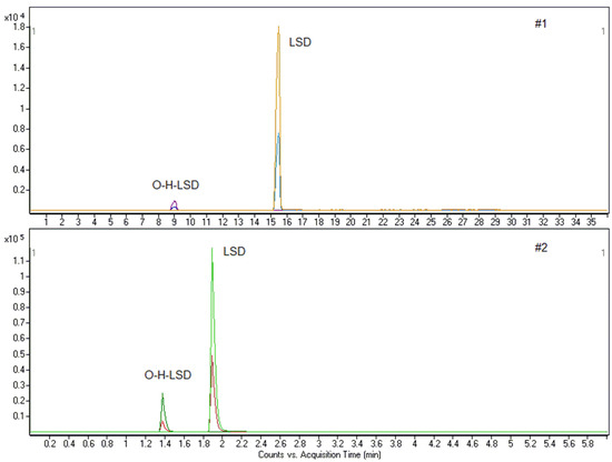 A 45-year-old male, reportedly a habitual cocaine and alcohol consumer, was hospitalized for time and space disorientation. At hospitalization, he reported the intake of one LSD-stamp 2 h. Analysis of whole blood with method #1 highlighted the presence of LSD and O-H-LSD, which were then quantified with method #2 at 8.60 and 1.14 ng/mL, respectively. The biological fluid resulted negative for cocaine, alcohol and other drugs of abuse by specific analytical methods [41,42] (Figure 3).