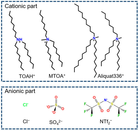 Structure of cations investigated (top): trioctylammonium ([TOAH]+), methyltrioctylammonium ([MTOA]+) and Aliquat 336. Structure of anions tested (bottom): sulphate (SO42−), chloride (Cl−) and bis(trifluoromethanesulfonyl)imide (NTf2−).