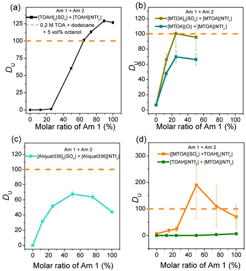 (a) Distribution coefficients of U of quaternary ammoniums mixtures carrying same cation and different anions (a–c) or different cations (d). Initial aqueous solution contains 0.1 mol.L−1 sulfuric acid (pH = 1), 1 mol.L−1 ammonium sulphate, 2500 mg.L−1 U(VI), and 250 mg.L−1 Fe (III) for (a) and 0.1 mol.L−1 sulfuric acid (pH = 1), 0.1 mol.L−1 ammonium sulphate, 250 mg.L−1 U(VI), and 250 mg.L−1 Fe (III) for (b–d). A/O = 2. Distribution coefficients of U measured in the same conditions for the reference system TOA-dodecane are presented in dashed orange lines on all graphs. Composition of Aliquat 336 is given in Supplementary Materials. Molar ratios higher than 50% are not presented in Figure 2b because the mixtures were not liquid/soluble.