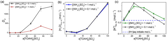 (a) Uranium distribution coefficient, (b) concentration of water in the organic phase after contact, and (c) concentration of acid in the aqueous phase after contact, measured for each mixture [TOAH]2[SO4] + [TOAH][NTf2] for 2 concentrations [(NH4)2SO4] = 0.1 and 1 mol.L−1 in the aqueous phase. A/O = 2. Composition of aqueous phase: 250 mg.L−1 U(VI), 250 mg.L−1 Fe (III), 0.1 mol.L−1 H2SO4.