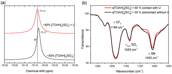 To obtain information about the chemical environment of NTf2− in the binary mixtures before and after uranium extraction, 19F-NMR and FT-IR measurements were carried out. Note that NTf2− gives only one resonance band in the 19F-NMR spectra. Its evolution provides information on the environmental change in the NTf2−. 19F-NMR spectra of the [TOAH]2[SO4] + [TOAH][NTf2] mixtures, which are plotted in Figure 4a for x[TOAH]2[SO4] = 50%. It shows that the chemical shift for NTf2− is not modified before and after uranium extraction, which indicates that NTf2− does not directly coordinate uranyl.