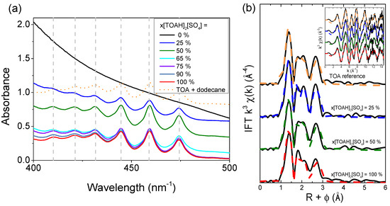 The UV-vis spectra recorded after contact with a uranium solution (Figure 5a) show the same type of fingerprint signal for 25 to 100% ratios as for the conventional medium (TOA + dodecane + octanol) shown in the dotted orange line. The different trend observed for the ratio 0% is due to the absence of uranium in this sample. As demonstrated by Servaes et al. who studied the speciation of uranyl nitrate complexes in acetonitrile and ionic liquid [33], this fingerprint is characteristic of a trigonal symmetric uranium complex. In their study, the spectra of complexes in acetonitrile or in [C4mim][NTf2] show signals similar to those observed for and complexes [34]. By comparing the experimental spectra with those reported in the literature, it can therefore be concluded that for all x[TOAH]2[SO4] ratios, the uranyl–sulphate complex exhibits D3h trigonal symmetry, suggesting that uranyl is complexed with three sulphates in an ionic liquid medium. EXAFS spectroscopy measurements were carried out to confirm this hypothesis.