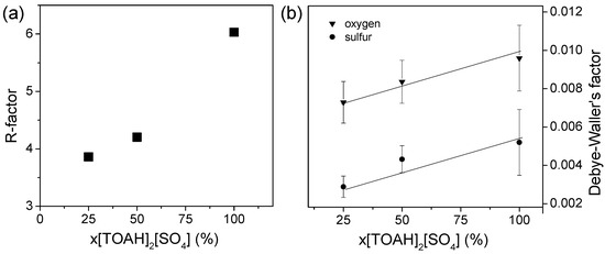 Good fits are obtained for all the x[TOAH]2[SO4] ratios, confirming the structure with three bidentate sulphates. As expected from the qualitative study of the data, the U-Oyl, U-Oeq, and U-S bond lengths do not vary. However, although this does not lead to outliers, the quality of the fit deteriorates for the higher x[TOAH]2[SO4] ratios: the R-factor increases from 3.9% to 6.0% (see Figure 6a). Furthermore, as shown in Figure 6b, the Debye–Waller factor increases, suggesting more disorder in the complexes. The evolution of these two parameters indicates that the U–3 sulphate complex is destabilized, which could explain the loss in uranium extraction for high x[TOAH]2[SO4] ratios.