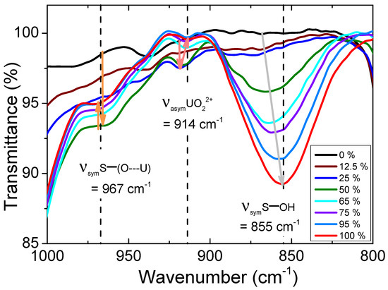The Fourier transform infrared (FT-IR) spectra of protonated tertiary amine mixtures are presented in Figure 7, Figure S2 and Figure S3. Three main bands can be distinguished in the region 800–1000 cm−1. The identification of resonance bands has been performed according to the results proposed in the literature based on a IR study dedicated to the structure of the tridecylammonium sulphate in the presence of uranium [36]. The three bands were therefore assigned to monodentate water-bound sulphates ν (S–OH) at 855 cm−1, to the uranyl motif ν (UO22+) at 914 cm−1, and to bidentate uranium-bound sulphates ν (S– (O…U)2 at 967 cm−1.