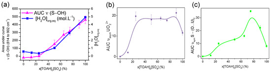 A linear shift of the ν (S–OH) absorption band towards the lower frequencies can be observed with the increasing molar ratio of sulphate. It indicates that sulphate becomes increasingly free (see Figure S4). The area under these ν (S–OH) band curves is plotted in Figure 8a. It shows an increase after the ratio x[TOAH]2[SO4] = 30% that follows the trend of the water extraction profile (see Figure 3b). This first observation suggests that the sulphates are not only involved in the uranyl complexes but also more and more connected with water, whose concentration is significantly increasing at high x[TOAH]2[SO4] ratios.