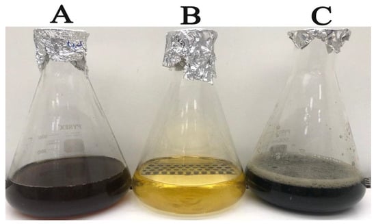 The bioinspired IONPs were synthesized using a water extract derived from the C. sinensis leaves. The results presented in Figure 1 demonstrate the utilization of the prepared extract to reduce the ferric nitrate solution, resulting in the generation of bioinspired IONPs. The formation of a black color in the solution indicated the successful development of the IONPs. The composition of the water extract from the C. sinensis leaves was determined using gas chromatography–mass spectrometry (GC-MS) in a previous investigation. The analysis revealed the presence of caffeine, catechol, 1,2,3-benzenetriol, 1,3,5-benzenetriol, 6-Hydroxy-4,4,7a-trimethyl-5,6,7a-tetrahydrobenzofuran, 1,1′-Biphenyl, 2-ethyl-, and methoxy resorcinol [37]. It was hypothesized that these phytoconstituents found in the green tea extract functioned as reducing agents for the ferric nitrate solution, and also as biostabilizing and capping agents. The bioprepared IONPs were characterized using different physicochemical techniques to detect their different physical and chemical features.