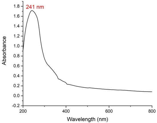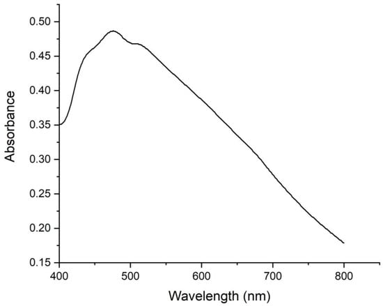 The emergence of a black-colored solution is attributed to the surface plasmon resonance (SPR) vibrations of the bioinspired IONPs. The process by which the IONPs were synthesized was observed using UV-visible spectroscopy. The UV-visible spectra of the synthesized IONPs exhibited a distinct peak at 241 nm, which may be attributed to SPR vibrations occurring inside the reaction mixture (Figure 2). The findings of our study align with those of a previous publication that reported the presence of a UV peak at 254 nm, which can be attributed to the SPR vibrations of the biogenic IONPs synthesized using an extract derived from Solanum lycopersicum leaves [36]. According to a previous study by Mirza et al. (2018), the presence of a distinctive absorbance peak at around 250 nm in the UV spectrum is a distinguishing property of IONPs [38]. The diffuse reflectance spectroscopy (DRS) technique can very efficiently determine the reflectance properties of powdered samples [39]. In this context, the findings revealed a strong absorption band within the visible light spectrum (400–800 nm), with a discernible peak seen at 475 nm (Figure 3). This observation suggests that the biogenic IONPs can potentially be used in photocatalytic reactions because their UV band falls between 400 and 800 nm in the visible light range [35,40]. The band gap energy of the biogenic IONPs was found to be 2.6 eV using Planck’s equation, Eg = hc/λ, where c is the speed of light = 3.0 × 108 m s−1, h is the Planck constant (4.136 × 10−15 eV s), and λ is the wavelength (475 × 10−9 m). The calculated band gap energy was matched with those of prior studies which reported the photocatalytic activities of iron oxide nanoparticles [41,42].