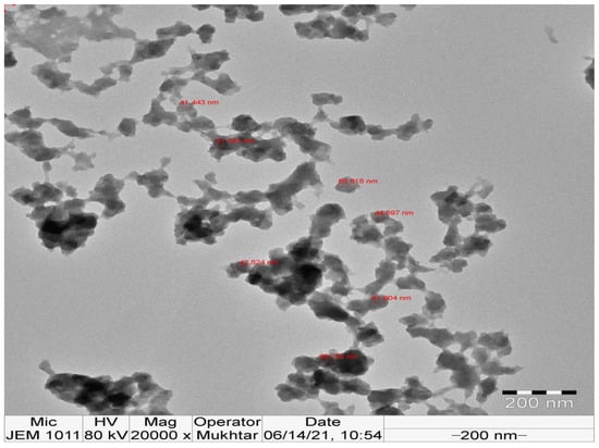 The biogenic IONPs underwent an initial triple washing process using deionized water. The specimens were positioned on a copper grid that had been covered with a layer of carbon, then removed and subjected to a drying process prior to analysis. A transmission electron microscope (JEOL, JEM1011, Tokyo, Japan) was used to conduct the analysis at the Electron Microscope Unit of the College of Science at King Saud University. The TEM test was used to observe and analyze the morphological characteristics and particle size distributions of the IONPs. This technique generated high-resolution two-dimensional pictures at a voltage of 100 kV.