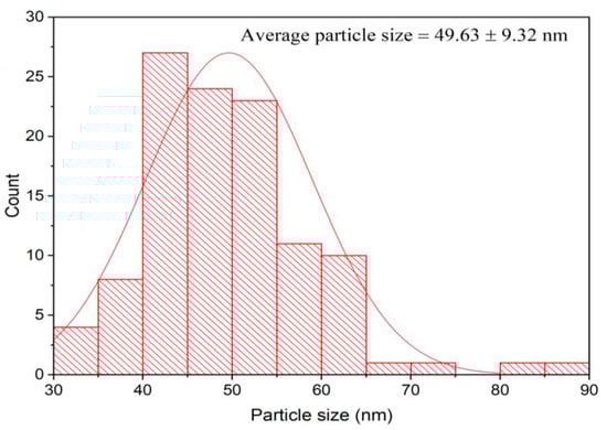 To determine the size, form, and particle size distribution of the bioinspired IONPS, a TEM examination was performed. As can be seen in Figure 6, the phytosynthesized IONPs were found to be spherical in shape and enclosed inside a matrix-like structure that might be attributed to the capping agents of the phytomolecules of the C. sinensis leaf extract used in the biosynthesis process. Figure 7 shows that the average diameter of the FeONPs was 49.63 ± 9.23 nm.