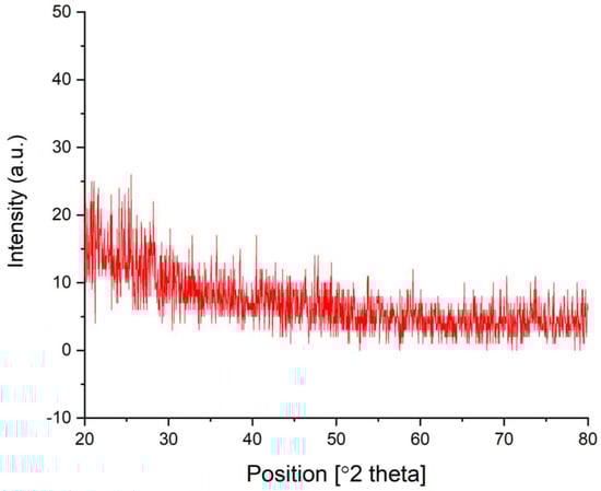The X-ray diffraction (XRD) pattern of the biogenic IONPs derived from the green tea extract was examined in order to gain a deeper understanding of the crystalline structures of the synthesized nanomaterials in their original state. As can be seen in Figure 8, the XRD pattern lacks discernible diffraction peaks, indicating that the synthesized IONPs possess an amorphous structure. Our findings align with those of prior reports that have demonstrated the amorphous forms of the biosynthesized IONPs [47,48]. Iron oxides may be found in nature in either amorphous or crystalline states [49]. Among the several crystalline forms, magnetite (Fe3O4), maghemite (γ-Fe2O3), and hematite (α-Fe2O3) are the most prevalent phases of iron oxides. Both the crystalline and amorphous forms of iron oxides exhibit distinct characteristics that enable their use in many sectors [50].