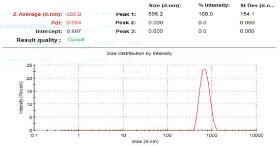 A zeta potential analysis of the bioinspired IONPs was conducted to investigate their surface charge, and the dynamic light scattering showed the average hydrodynamic diameter of the colloidal nanoparticles. It was observed that the average hydrodynamic diameter of the bioinspired IONPs was 655 nm (Figure 9), a value notably larger than that obtained through the TEM analysis. This disparity can be attributed to the fact that the TEM technique measures the diameter of both the biogenic IONPs and the capping molecules surrounding them, as evidenced by the TEM micrographs, as well as the additional hydrate layers enveloping the bioinspired IONPs [59]. However, the surface charge of the bioinspired IONPs was −5.69 mV (Figure 10). The observed negative surface charge of the bioinspired IONPs might be attributed to the presence of capping biomolecules derived from the extract used in the biosynthesis. The stability of nanoparticles is influenced by many parameters, including the physicochemical properties of the solvent, the extract, electrostatic interactions, and van der Waals forces [60]. The inclusion of hydroxyl (OH) functional groups on the surface of the iron oxide nanoparticles was shown to be crucial in generating negative charges on the nanoparticles [61]. The biogenic IONPs possessed a negative surface charge, which we attribute to the presence of capping molecules from the extract. This observation indicates that the biosynthesized nanoparticles exhibited repulsive forces which contributed to their colloidal stability [62].