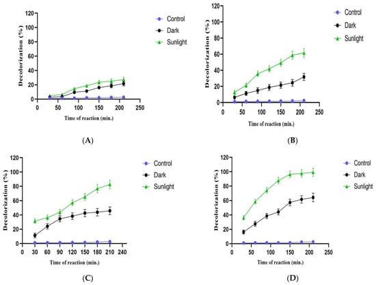 Decolorization percentages of crystal violet dye at different time intervals and different biogenic IONP concentrations. (A) Decolorization percentages at an IONP concentration of 0.125 mg/mL; (B) decolorization percentages at an IONP concentration of 0.250 mg/mL; (C) decolorization percentages at an IONP concentration of 0.50 mg/mL; (D) decolorization percentages at an IONP concentration of 1.0 mg/mL.