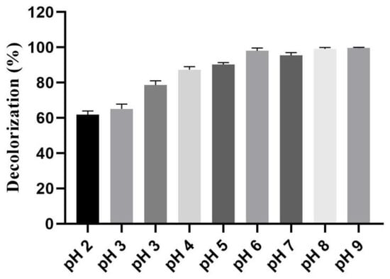 The photocatalytic performance of the biogenic IONPs was assessed under several pH values in order to identify the optimal parameters for the photocatalytic process. The biogenic IONPs exhibited their maximum photocatalytic activity at pH values of 6, 8, and 9. This was shown by the respective relative decolorization percentages of 98%, 99.1%, and 99.6%, which are shown in Figure 12.
