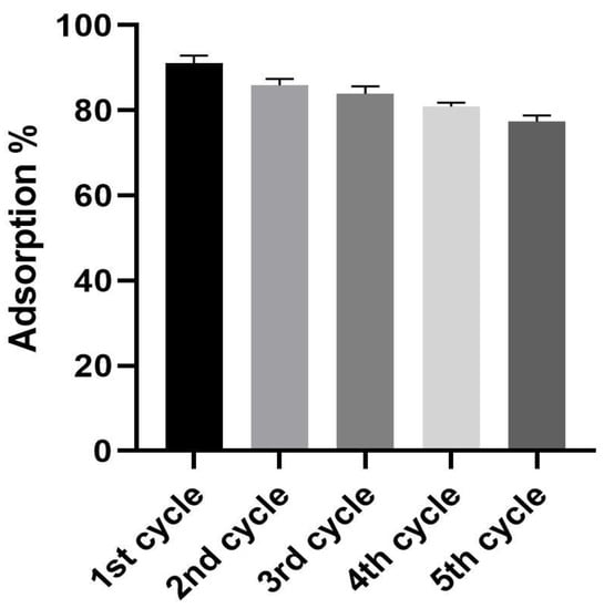 A cycling test of the biogenic IONPs demonstrated that their adsorption percentage slightly decreased from 91.05 to 77.41% after five cycles (Figure 13). This finding provides clear evidence of the potential reusability of the biogenic IONPs. However, it is worth noting that the slight decrease in observed adsorption percentages may be attributed to the washing process, which has the potential to reduce adsorption efficiency [69]. Additionally, it is possible that some of the adsorption sites may become denatured or covered by pollutants, leading to a decrease in overall adsorption efficiency [70]. Figure 14 shows an SEM image of the sample after the cycling test showed the presence of nanoparticles with increased size due to the adsorption of the crystal violet dye by the biogenic IONPs, which led to the clumping and aggregation of the nanoparticles together.
