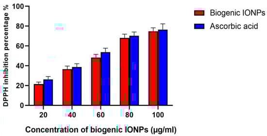 The DPPH inhibition percentages of the biogenic IONPs synthesized using the C. sinensis leaf extract were determined at concentrations ranging from 20 to 100 µg/mL. The results showed that the inhibition percentages varied from 21.45% to 74.69%, respectively (Figure 15). The DPPH inhibition percentages of the ascorbic acid varied from 26.14% to 76.48% across doses ranging from 20 to 100 µg/mL, respectively. Furthermore, the determined IC50 value of the biogenic IONPs was 64.31 µg/mL, while the standard ascorbic acid exhibited an IC50 of 56.87 µg/mL.