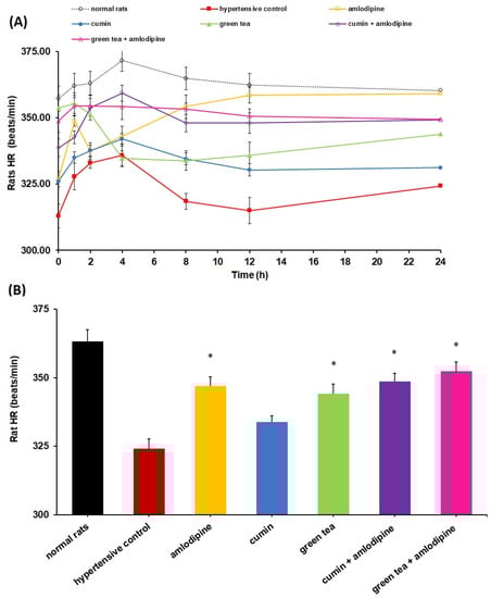 Impact of amlodipine, cumin, green tea, cumin + amlodipine, and green tea + amlodipine on HR of hypertensive rats. (A) HR change over the course of 24 h; (B) mean HR over 24 h in response to treatments. (Mean ± SEM, * p < 0.05, n = 5).