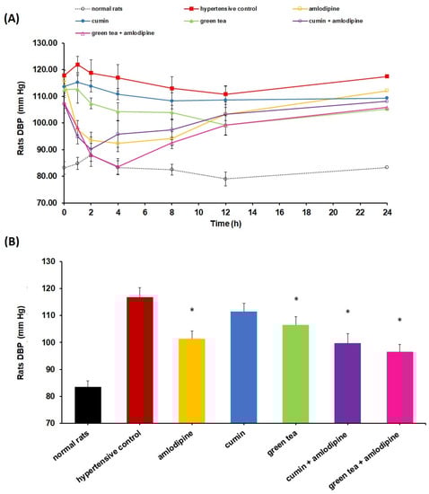 Impact of amlodipine, cumin, green tea, cumin + amlodipine, and green tea + amlodipine on DBP of hypertensive rats. (A) DBP changes over 24 h in response to treatments; (B) average DBP changes over 24 h in response to treatments (mean ± SEM, * p < 0.05, n = 5).