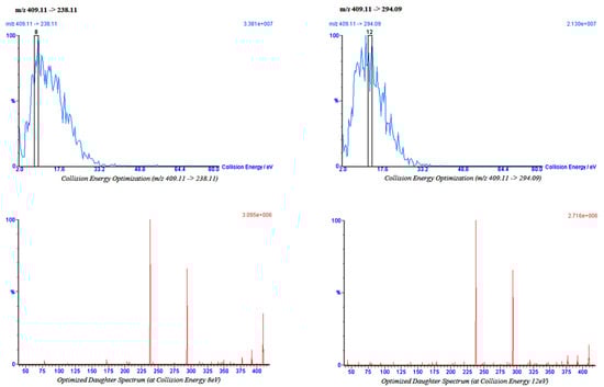 The charged fragments of amlodipine were monitored at mass-to-charge ratio (m/z) 409.1 > 238 and m/z 409.1 > 294 with an optimum collision energy of 8 eV and 12 eV, respectively (Figure 5).