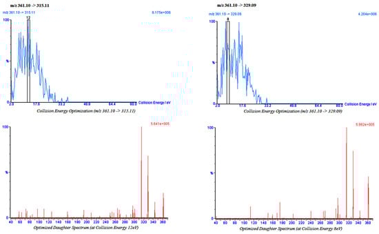 While the optimized collision energy for IS daughters monitored at m/z 361.1 > 315.1 and m/z 361.1 > 329.1 was 12 eV, 8 eV, respectively (Figure 6).
