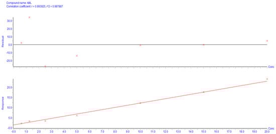 The representative chromatograms of amlodipine daughters and IS daughters were shown in Figure 7. Additionally, the calibration curve for the analytical method exhibited strong linearity between 0.6 and 20 ng/mL, with correlation coefficient (r2) equal to 0.99 (Figure 8).